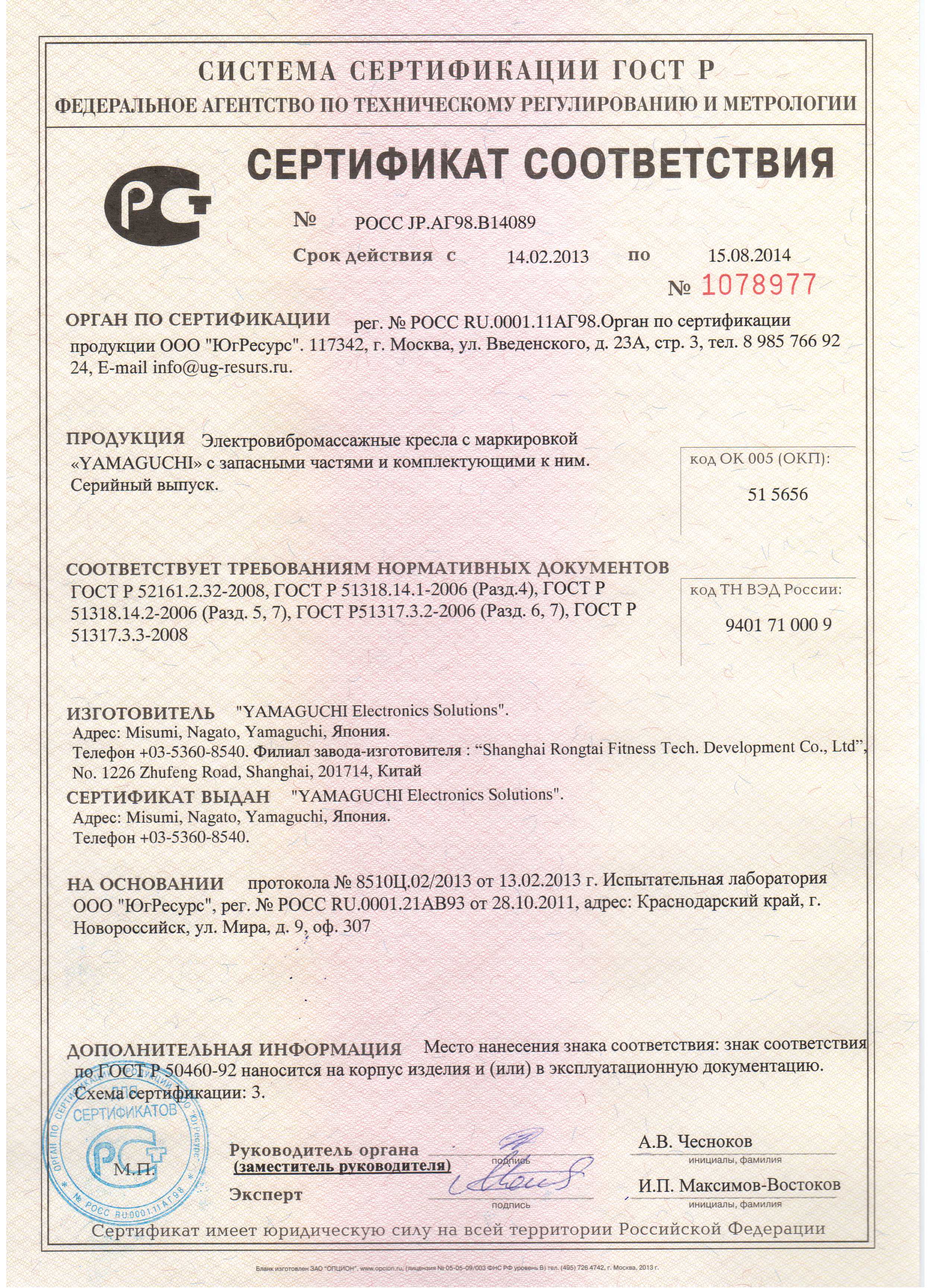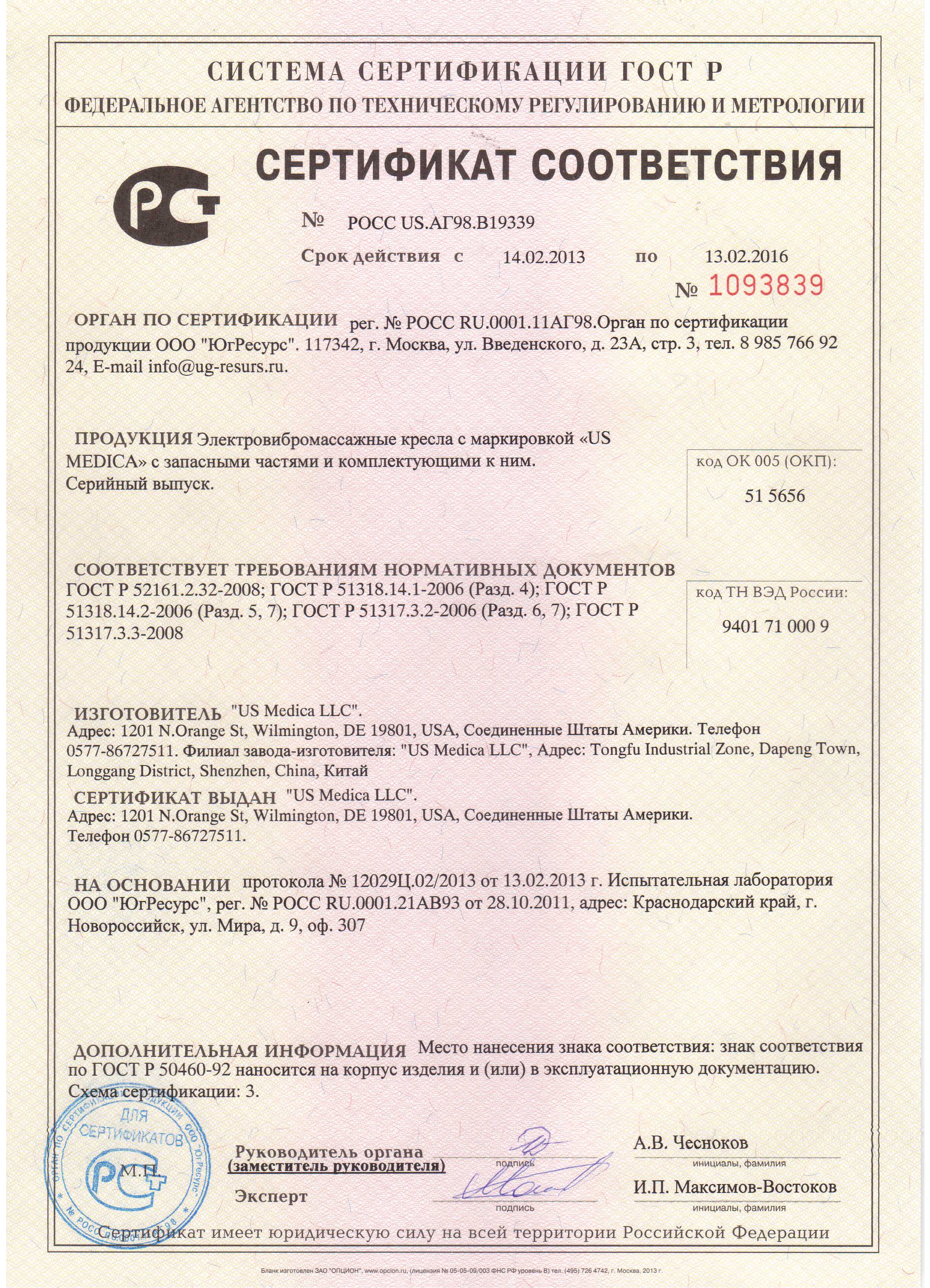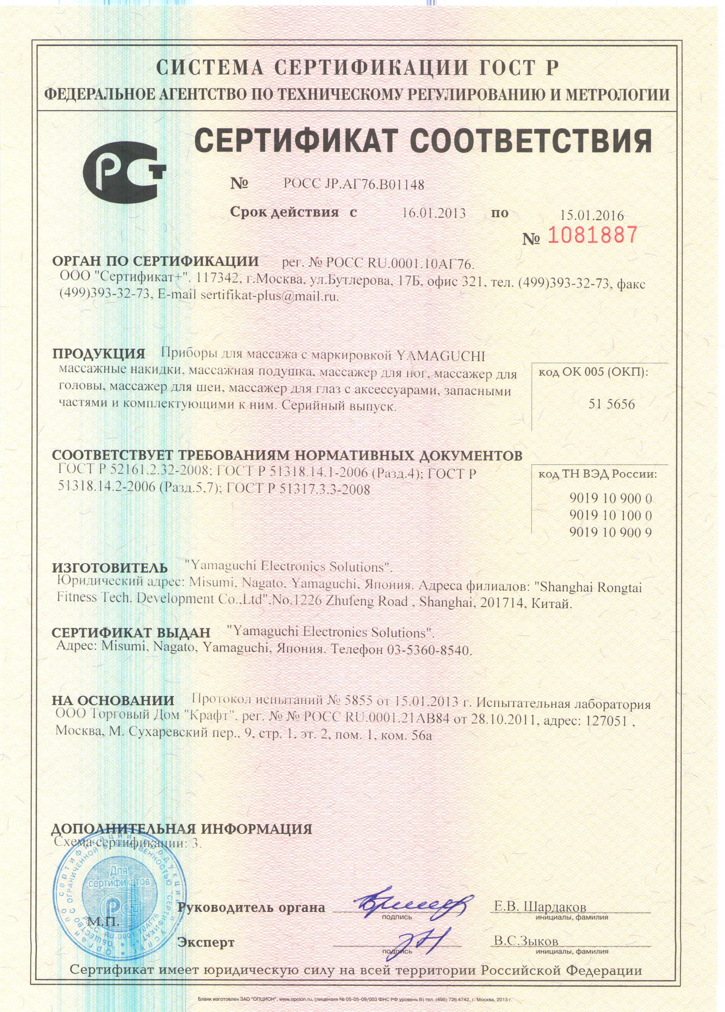 Сертификаты соответствия: