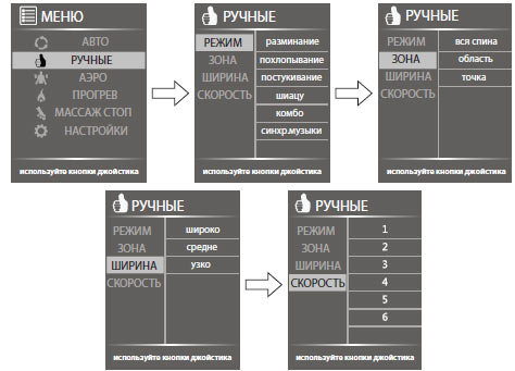 | Зоны массажа | Шея, плечи, спина, поясница, руки, ягодицы, бёдра, икры, стопы |